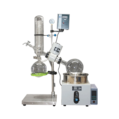 蒸發(fā)瓶恒速旋轉(zhuǎn),水浴鍋恒溫加熱,在此條件下:物料在蒸發(fā)瓶內(nèi)壁形成大面積均勻薄膜快速蒸發(fā),在真空條件下可以提高蒸發(fā)效率(需連接真空裝置),溶媒蒸汽經(jīng)玻璃冷凝盤管時冷卻成液體(需連接冷卻裝置),回收于收集瓶。