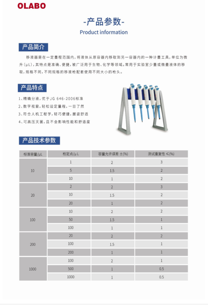 國產(chǎn)OLABO,B系列單道可調(diào)式移液器10-100μl量程:10-100μl,精確分液,數(shù)字視窗,符合人體工學,握姿舒適